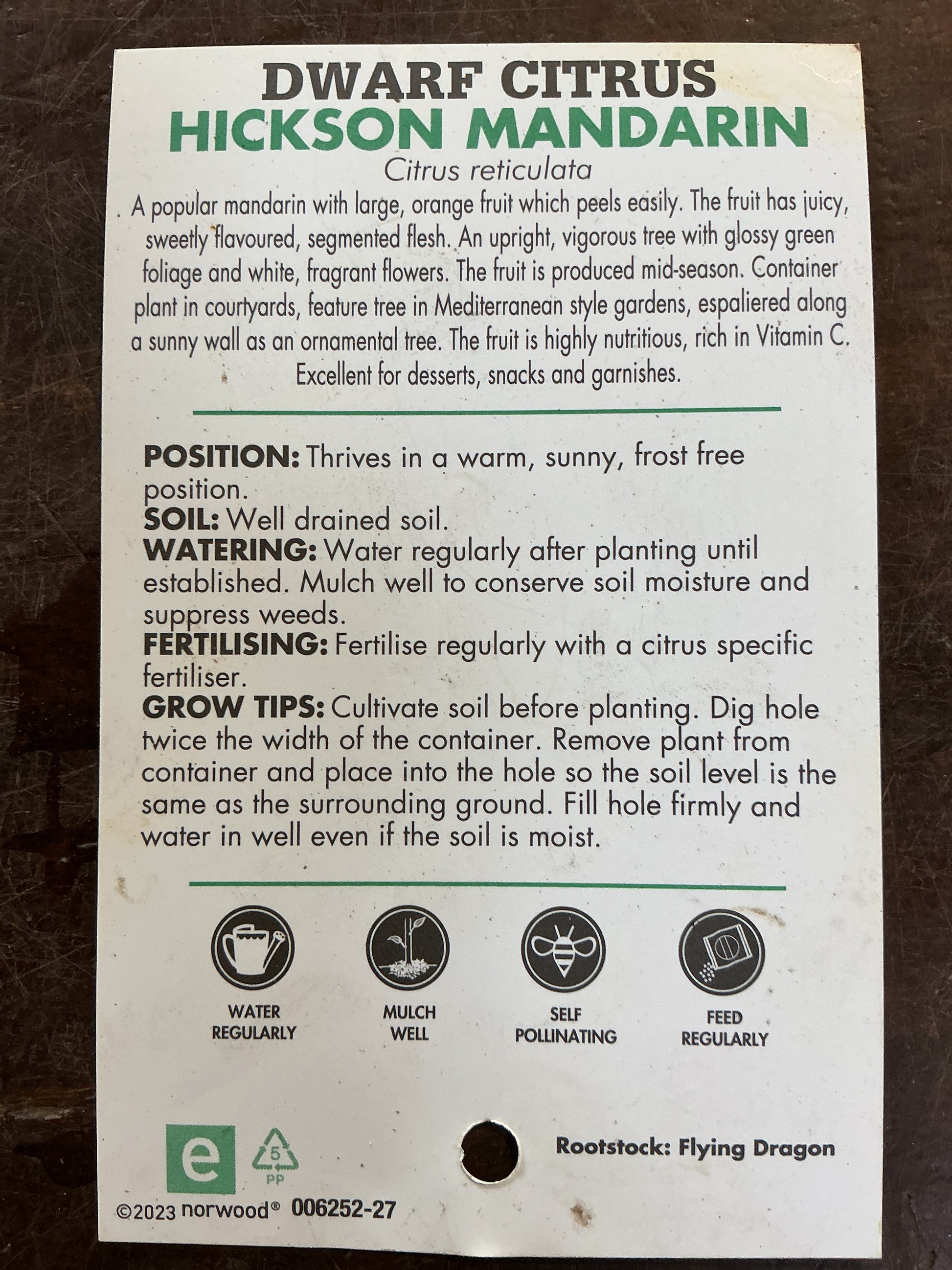 A popular mandarin with large, orange fruit which peels easily. The fruit has juicy, sweetly flavoured, segmented flesh. An upright, vigorous tree with glossy green foliage and white, fragrant flowers. The fruit is produced mid-season. Container plant in courtyards, feature tree in Mediterranean style gardens, espaliered along a sunny wall as an ornamental tree. The fruit is highly nutritious, rich in Vitamin C. Excellent for desserts, snacks and garnishes.