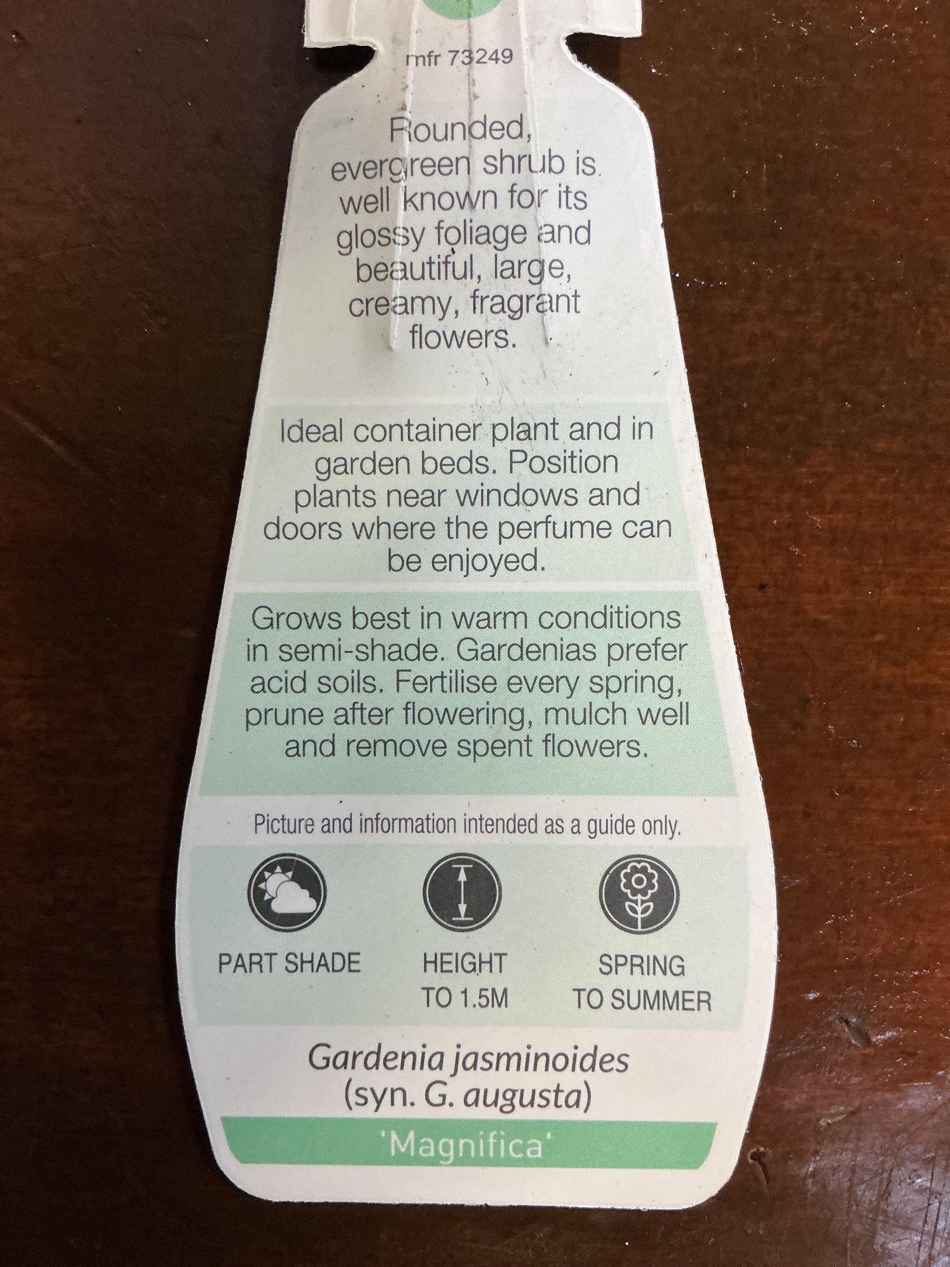 Grows best in warm conditions in semi-shade. Gardenias prefer acid soils. Fertilise every spring, prune after flowering, mulch well and remove spent flowers.