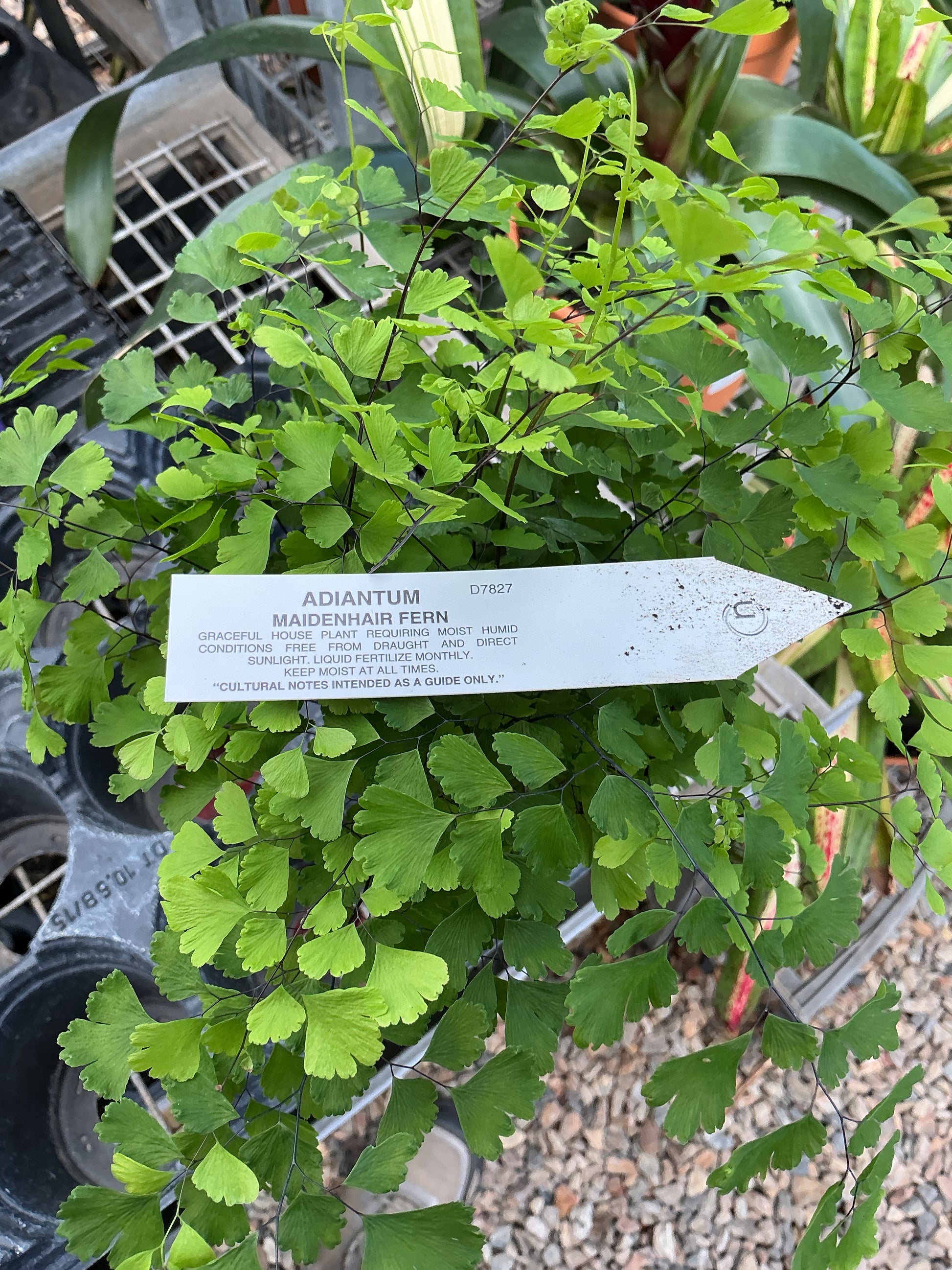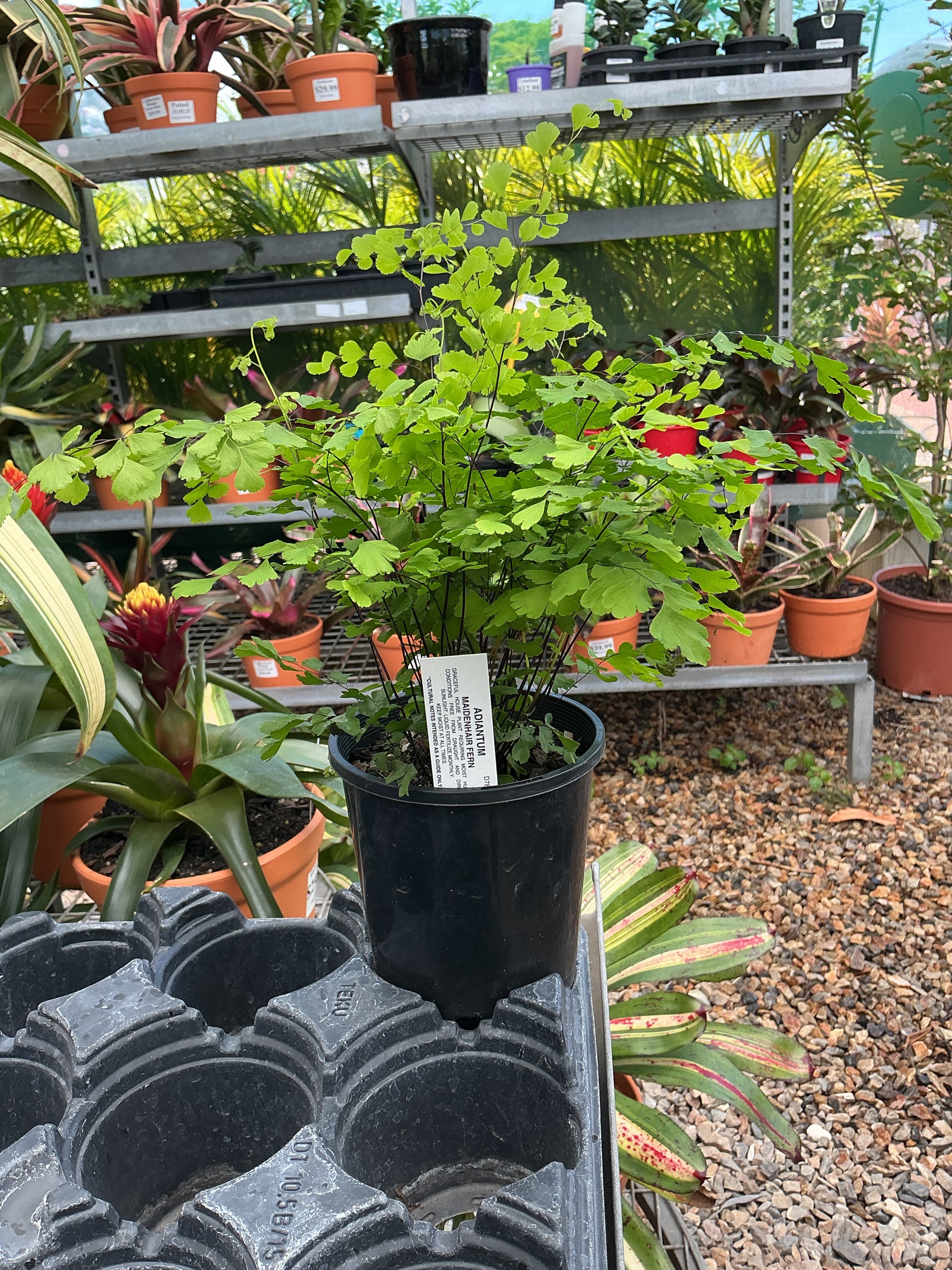 Delicate, airy houseplant known for its feathery, fan-shaped fronds on dark, wiry stems, It thrives in bright, indirect light and high humidity, making it perfect for bathrooms or terrariums, but requires consistent moisture without being waterlogged.