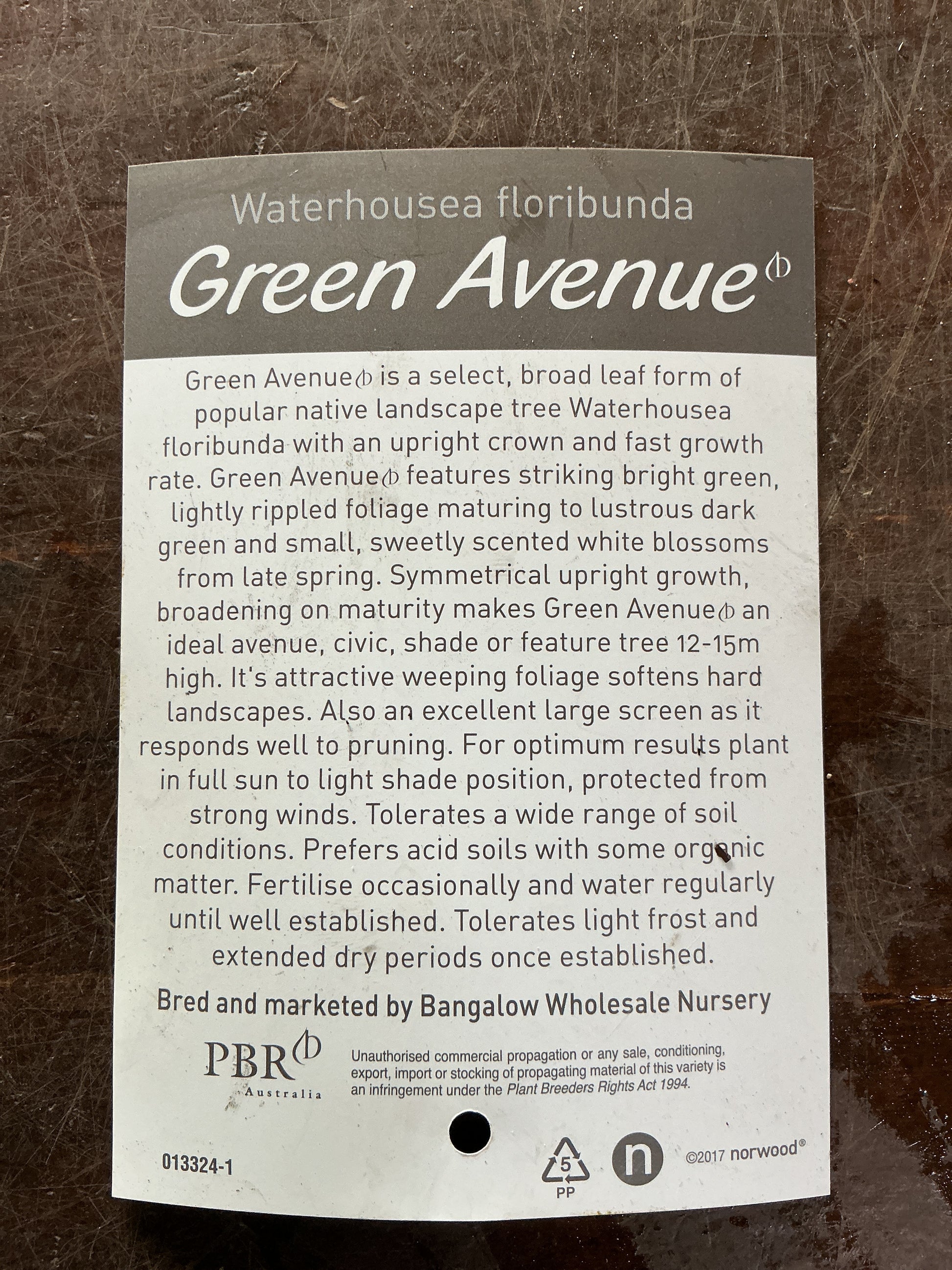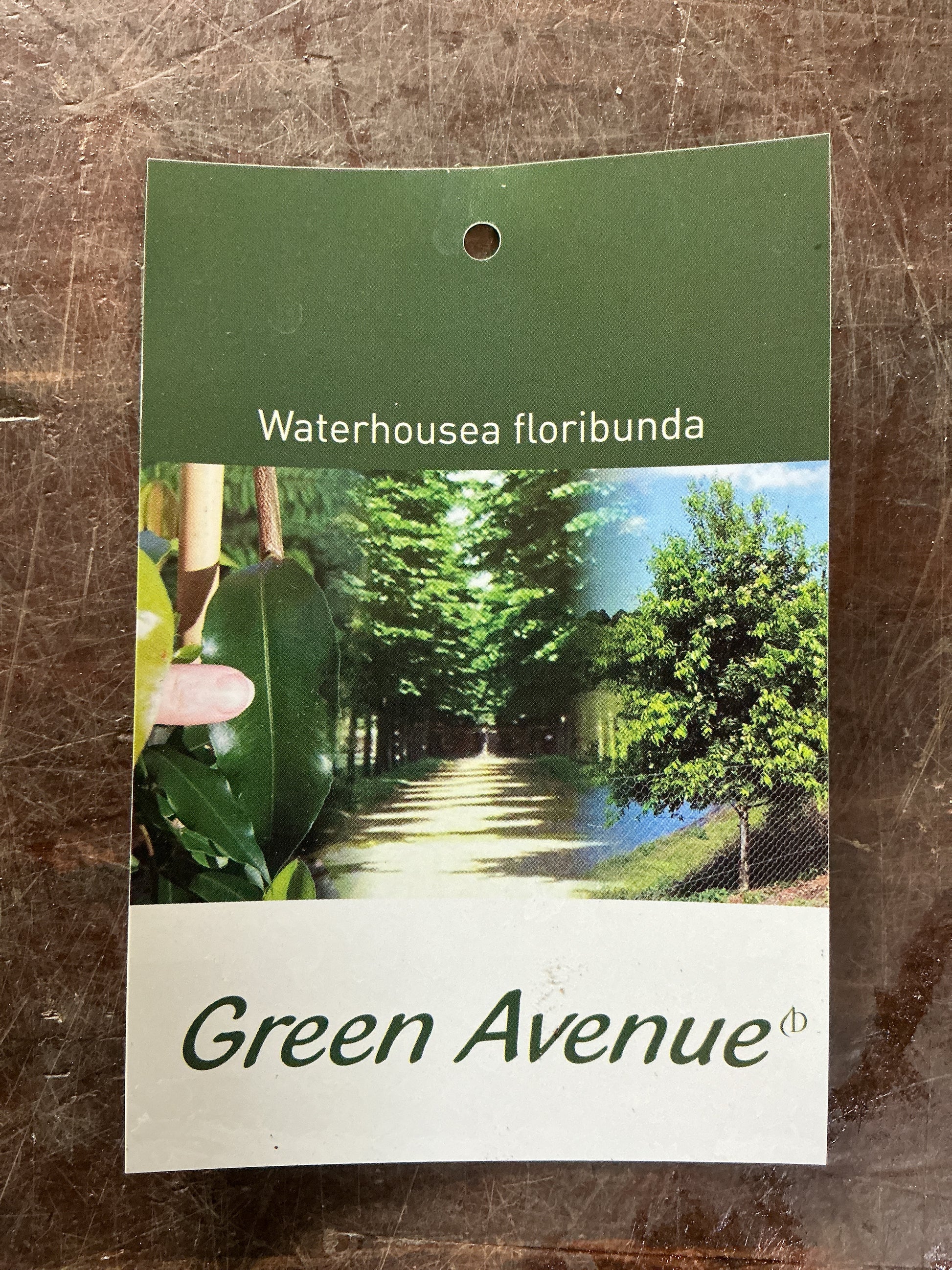 Green Avenue is a select, broad leaf form of popular native landscape tree Waterhousea floribunda with an upright crown and fast growth rate. Green Avenue features striking bright green, lightly rippled foliage maturing to lustrous dark green and small, sweetly scented white blossoms from late spring. Tolerates light frost and extended dry periods once established. Height to 10m.